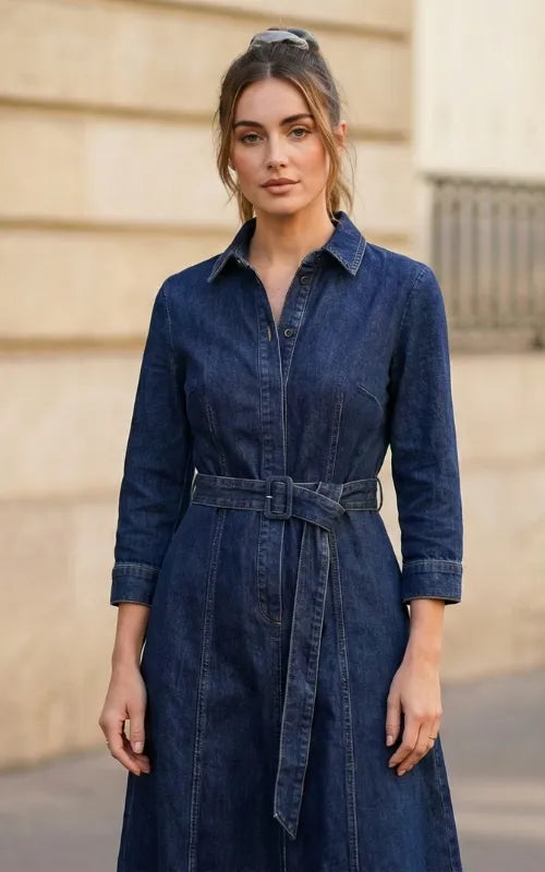 Le denim s'invite au bureau avec autorité et féminité. Structurée par un blazer sombre et accessoirisée d'un sac en cuir graphique, votre robe en jean se transforme en un incontournable du vestiaire "Business", à la fois moderne et sérieux.