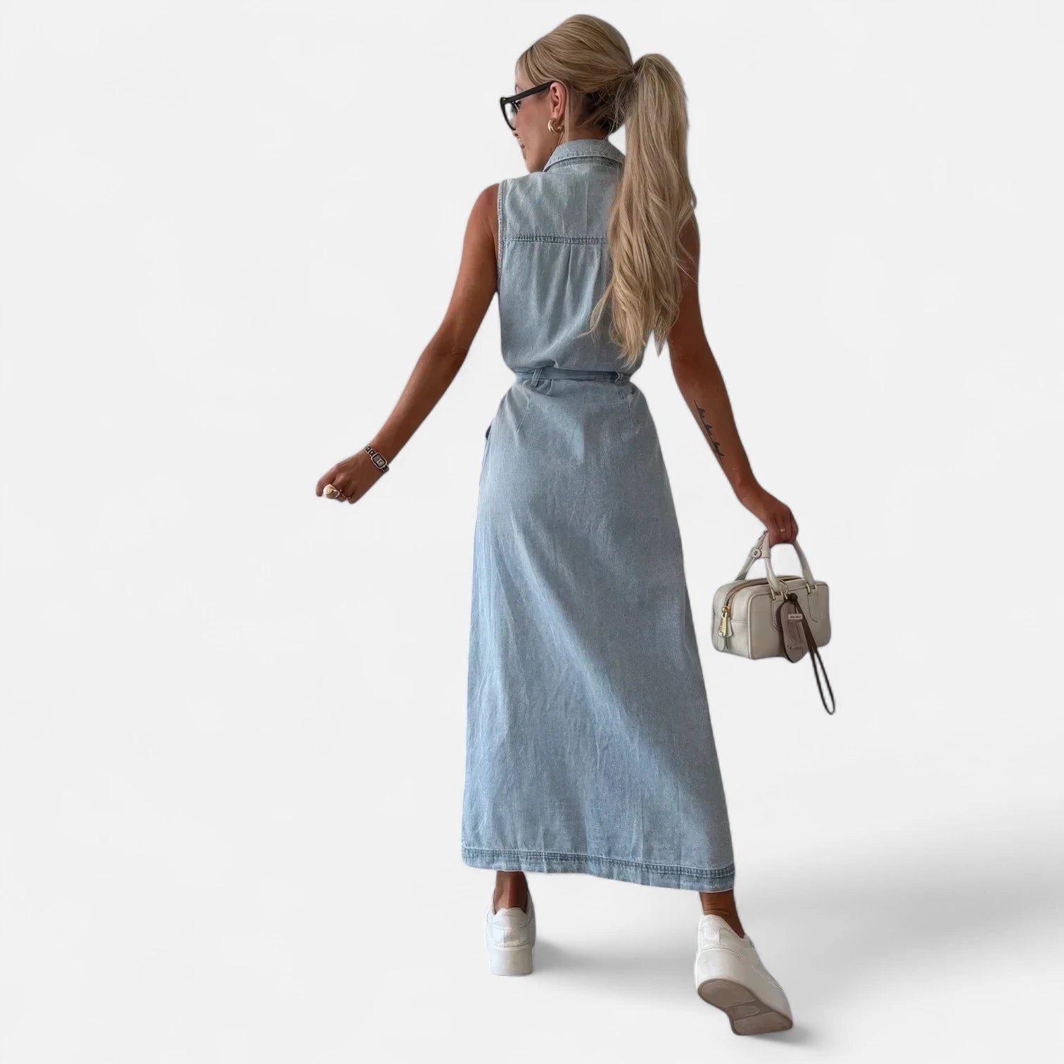 Cette robe longue en denim clair mise sur une coupe fluide et droite, idéale pour une silhouette élancée. Sans manches et pourvue d’un col chemise classique, elle se boutonne sur toute la longueur avec des boutons effet nacre. Le denim légèrement délavé présente une texture souple et non extensible, agréable à porter au quotidien. Deux poches poitrine à rabat ajoutent une touche de caractère tandis que la fente frontale facilite les mouvements.