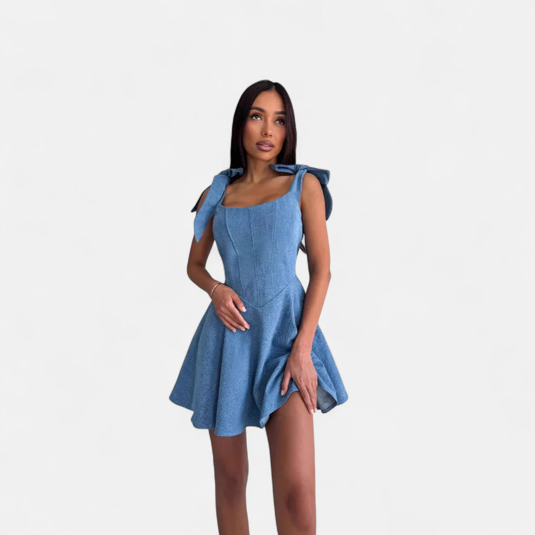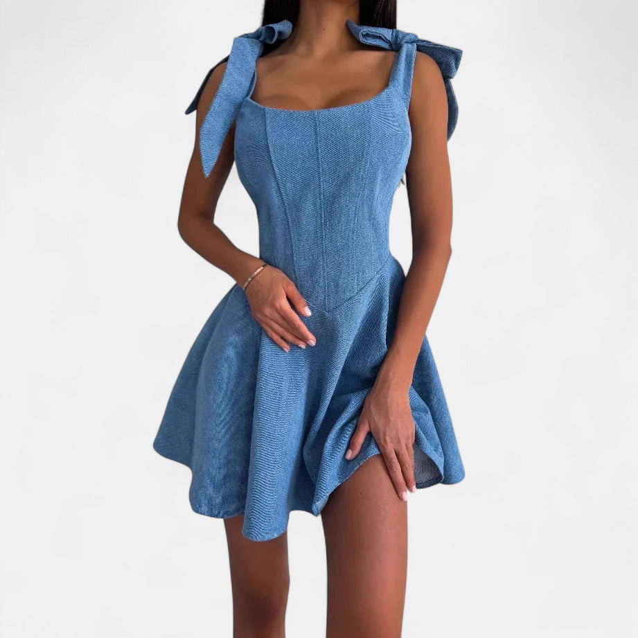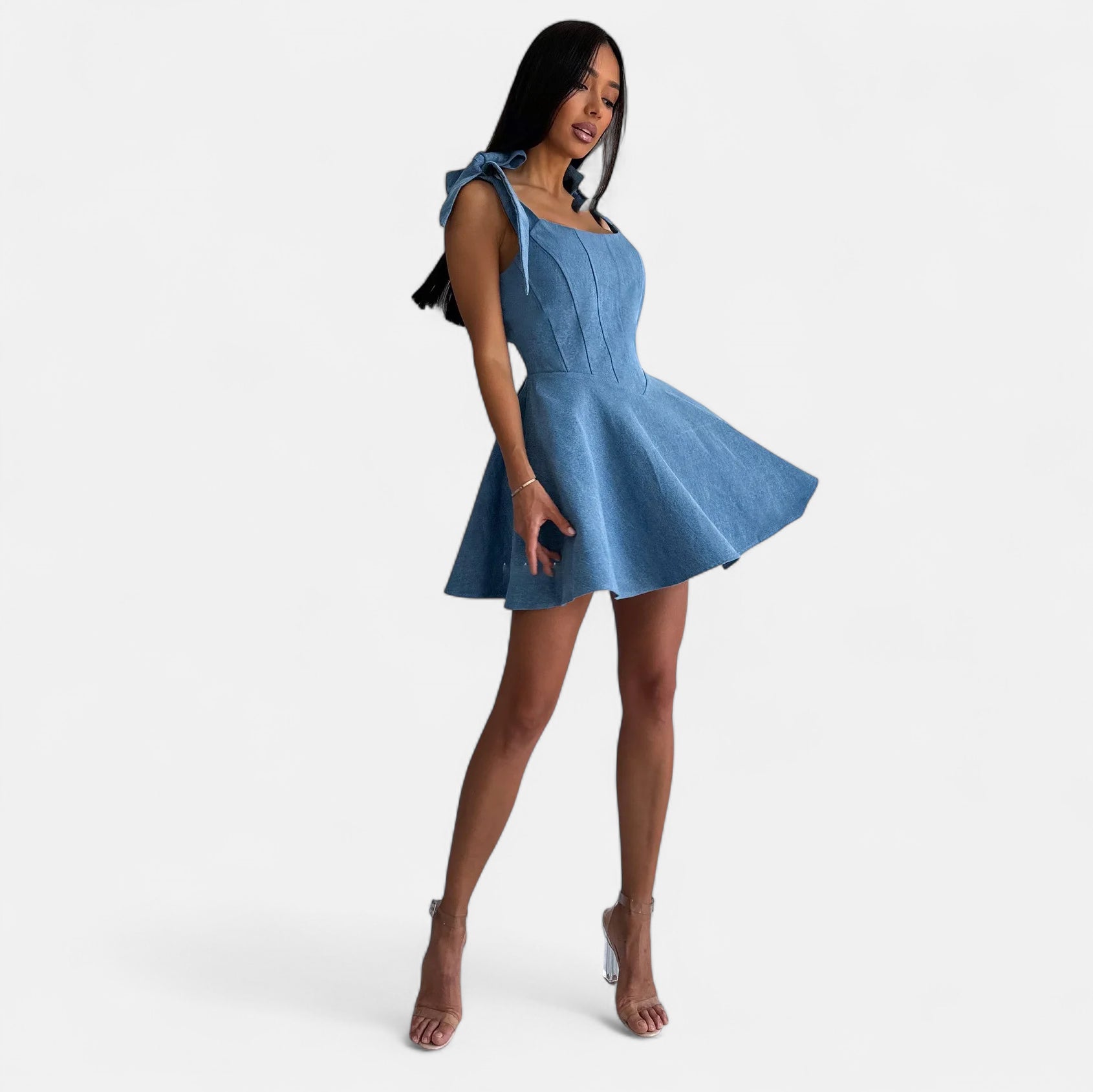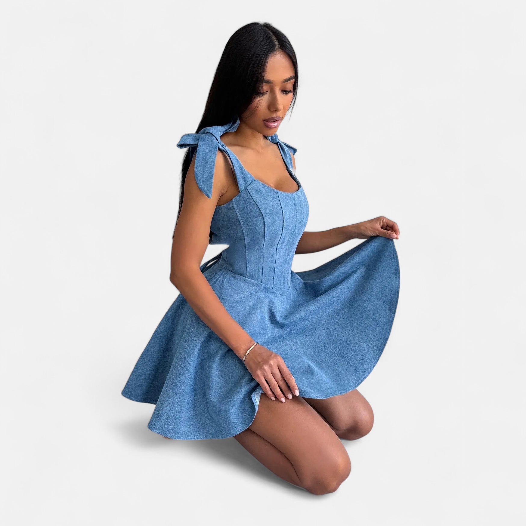 Craquez pour cette robe courte en denim bleu, une pièce incontournable qui allie fraîcheur estivale et élégance décontractée. Avec son encolure droite et ses larges bretelles à nœuds, elle offre une touche féminine affirmée. Sa coupe bustier structurée met en valeur le buste, tandis que sa jupe évasée crée un joli mouvement. Son tissu légèrement extensible assure confort et aisance au quotidien.