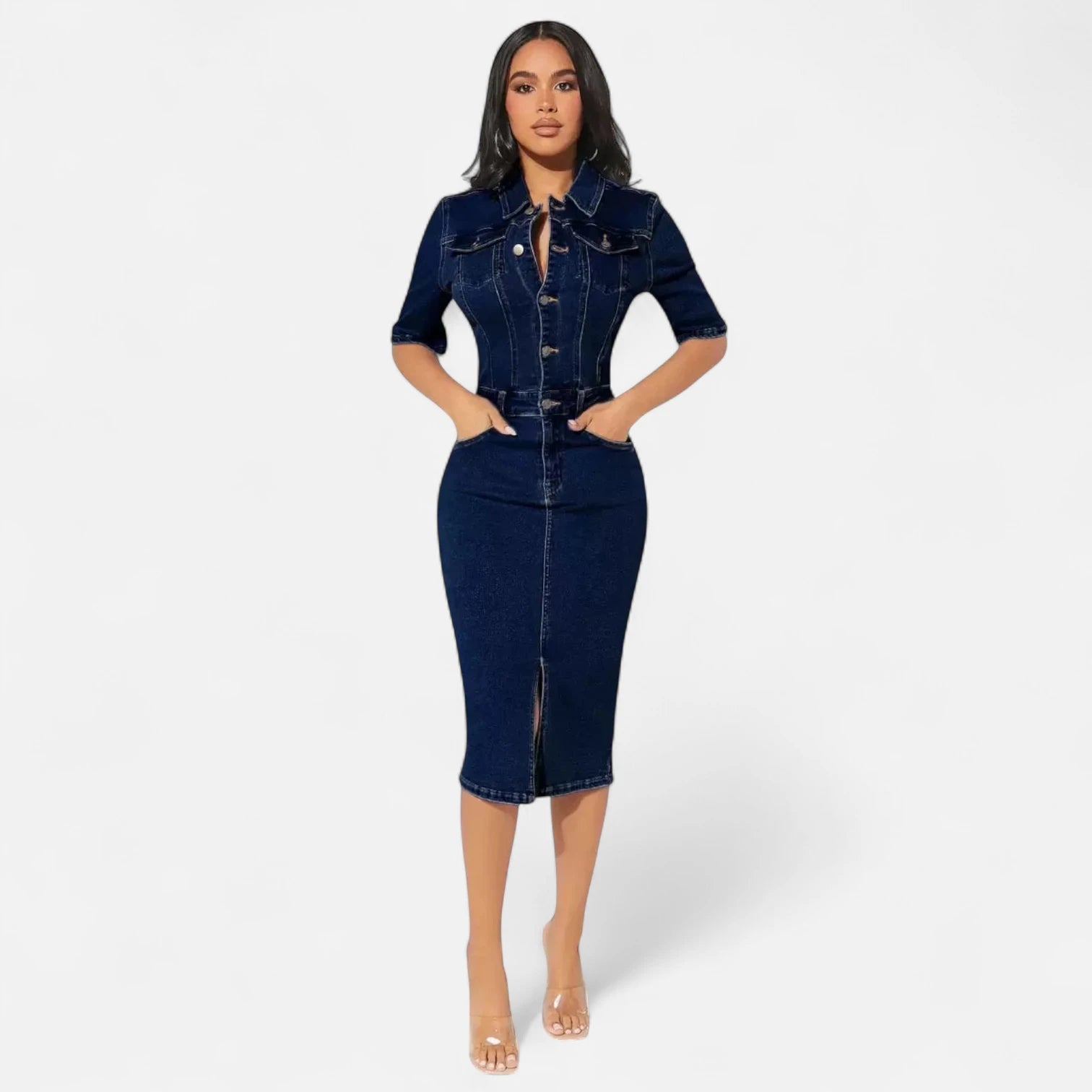 Cette robe en jean brut propose une allure structurée tout en conservant une grande simplicité de lignes. Confectionnée dans un denim foncé à la texture légèrement rigide, elle souligne la silhouette grâce à sa coupe droite et ajustée. Sa longueur sous le genou ajoute une note raffinée qui s’adapte aussi bien à un cadre professionnel qu’à une sortie en ville. Le tissu, pensé pour offrir discrètement de la souplesse, accompagne les mouvements sans perdre son maintien.