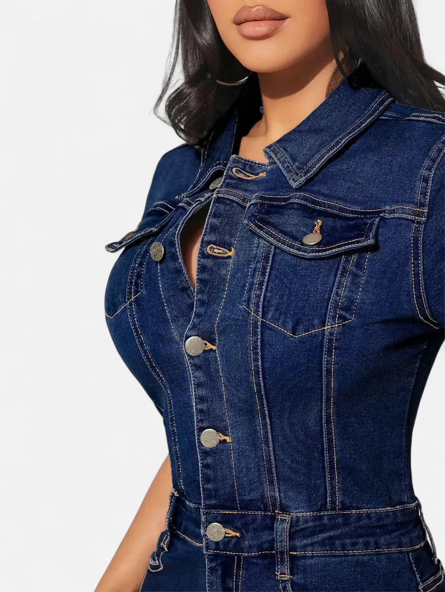Dotée d’un col chemise classique et de manches courtes, elle affirme un style intemporel. La fermeture boutonnée sur le devant trace une ligne verticale nette qui accentue la sobriété du modèle. Deux poches poitrine à rabat et surpiqûres contrastantes apportent une touche de relief visuel. Une ceinture assortie permet d’ajuster la taille pour une silhouette bien définie. Une fente subtile à l’arrière facilite la marche et apporte davantage de fluidité au tombé du denim.