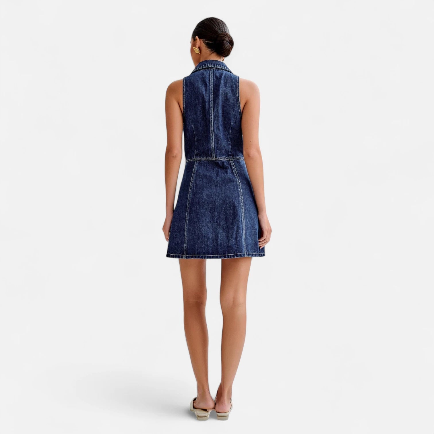 Cette robe en jean cintrée attire immédiatement le regard par sa teinte bleu foncé légèrement lavée et ses surpiqûres écrues bien visibles, qui soulignent les lignes verticales de la coupe. Sans manches et col tailleur plongeant, elle offre un porté estival et structurant, parfait pour valoriser la silhouette. Sa forme trapèze, ajustée à la taille et évasée sur les hanches, affine visuellement tout en restant confortable.