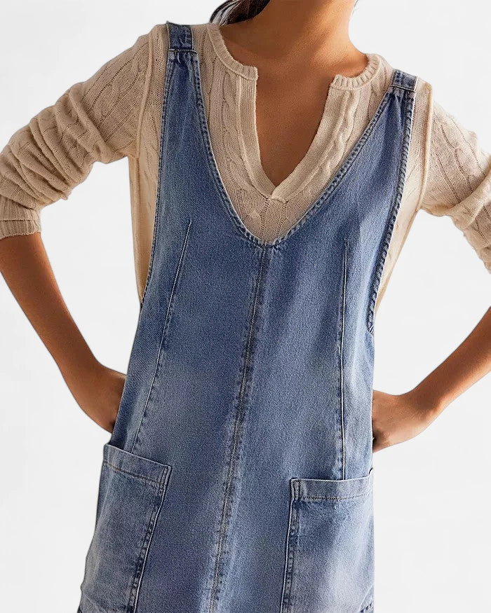 Son design sans manches à larges bretelles structure le buste tout en mettant en valeur une encolure en V profonde. Les surpiqûres marquées élancent la silhouette, tandis que les deux poches plaquées frontales combinent esthétisme et praticité. Longueur au-dessus du genou, coupe légèrement trapèze : elle assure confort et liberté de mouvement. Portée sur un top ajusté ou une chemise fluide, elle s’adapte facilement aux variations de style.