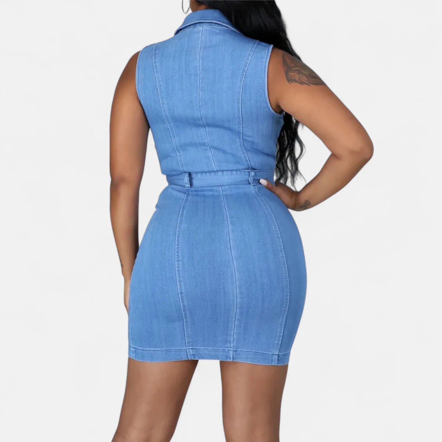 Conçue pour sublimer vos courbes grâce à sa coupe ajustée et sa matière légèrement stretch, cette robe allie aisance et raffinement. Sans manches et dotée d'une fermeture zippée sur toute la longueur, elle séduit par son col V et sa ceinture nouable qui structure la taille. Les poches à rabat avec bouton-pression ajoutent un esprit utilitaire tendance. Le denim clair et les surpiqûres apparentes accentuent son allure moderne et flatteuse.