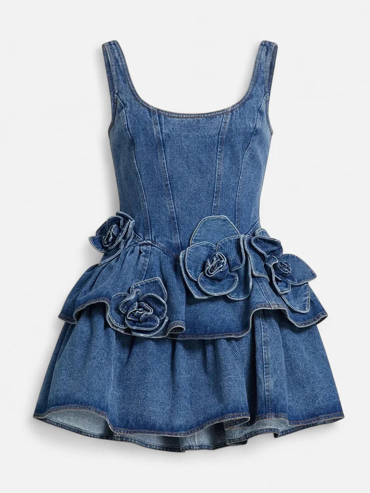 Confectionnée dans un denim souple légèrement extensible, cette robe courte présente un buste ajusté avec col rond plongeant, sans manches, et une jupe évasée à double volant. Les grandes fleurs sculptées dans le même tissu ajoutent une texture audacieuse et un volume structuré. Elle se porte facilement grâce à sa fermeture discrète au dos. Facile d'entretien, elle allie originalité et confort au quotidien.