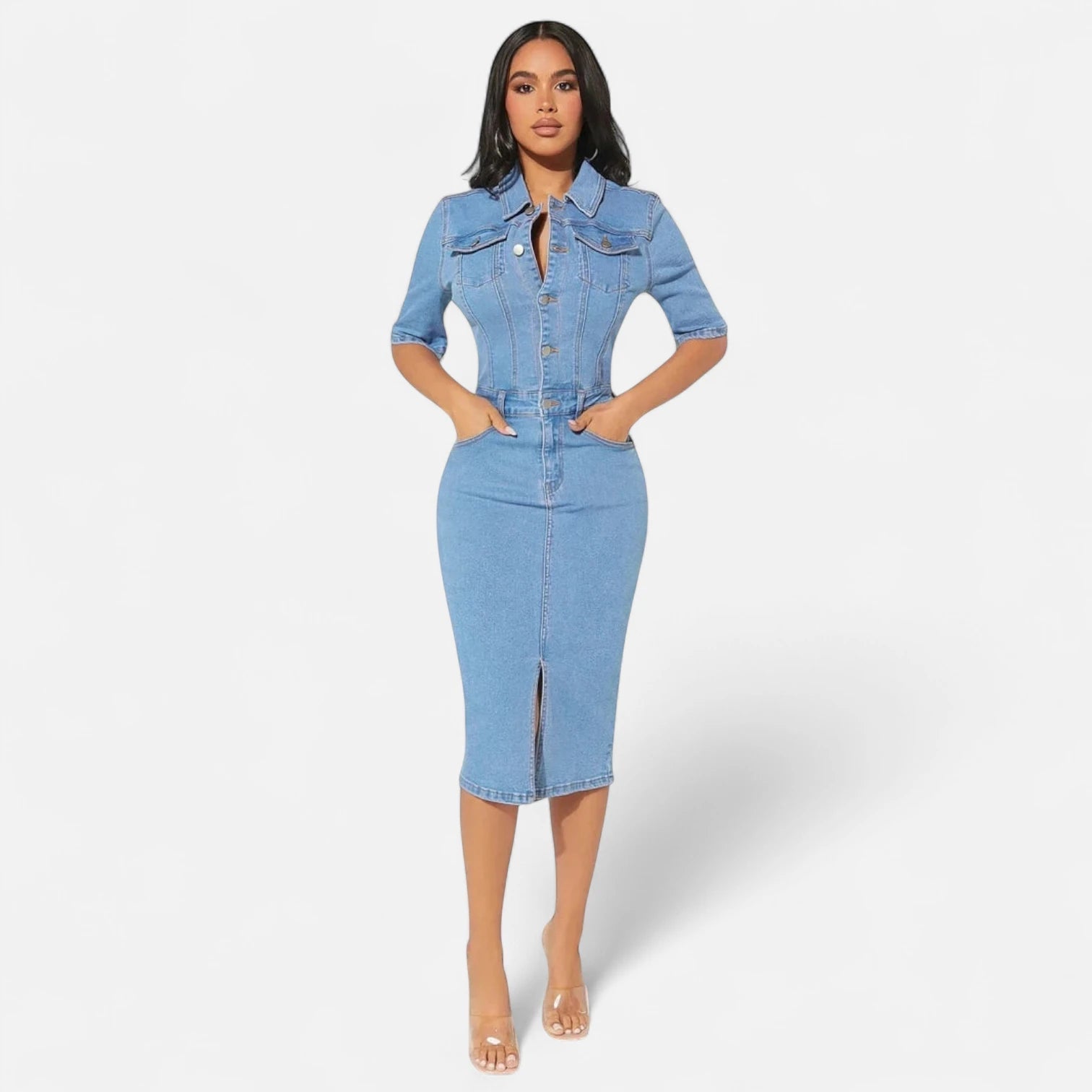 Confectionnée dans un denim bleu moyen aux reflets légèrement délavés, cette robe mi-longue associe allure moderne et authenticité du tissu. Sa coupe cintrée met en valeur la taille sans excès, tandis que le tombé souple au niveau des jambes assure une élégance naturelle. La matière stretch accompagne subtilement les mouvements et souligne les lignes féminines avec équilibre. Le col chemise classique apporte structure, renforcé par la ligne verticale créée par le boutonnage intégral qui élance la silhouette.