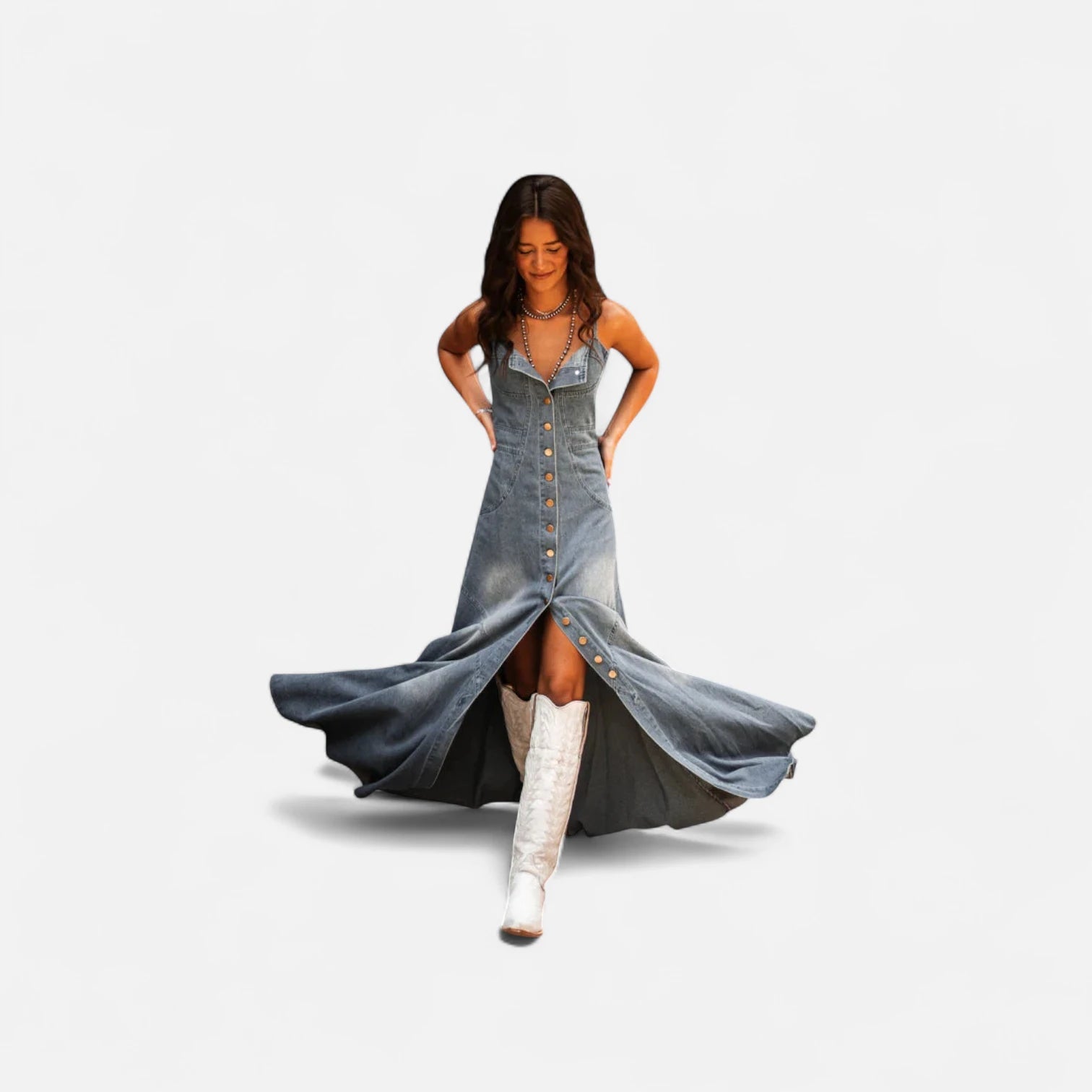 Cette robe longue en jean se distingue par ses fines bretelles et son boutonnage intégral qui allonge la silhouette avec élégance. Confectionnée dans un denim bleu légèrement délavé, elle associe un look structuré à une coupe fluide évasée, idéale pour accompagner vos mouvements. Le décolleté en cœur et les coutures apparentes soulignent avec finesse le buste et la taille. Les boutons métalliques apportent une touche contrastée et pratique pour l’enfiler facilement. Un modèle pensé pour conjuguer confort et caractère affirmé.