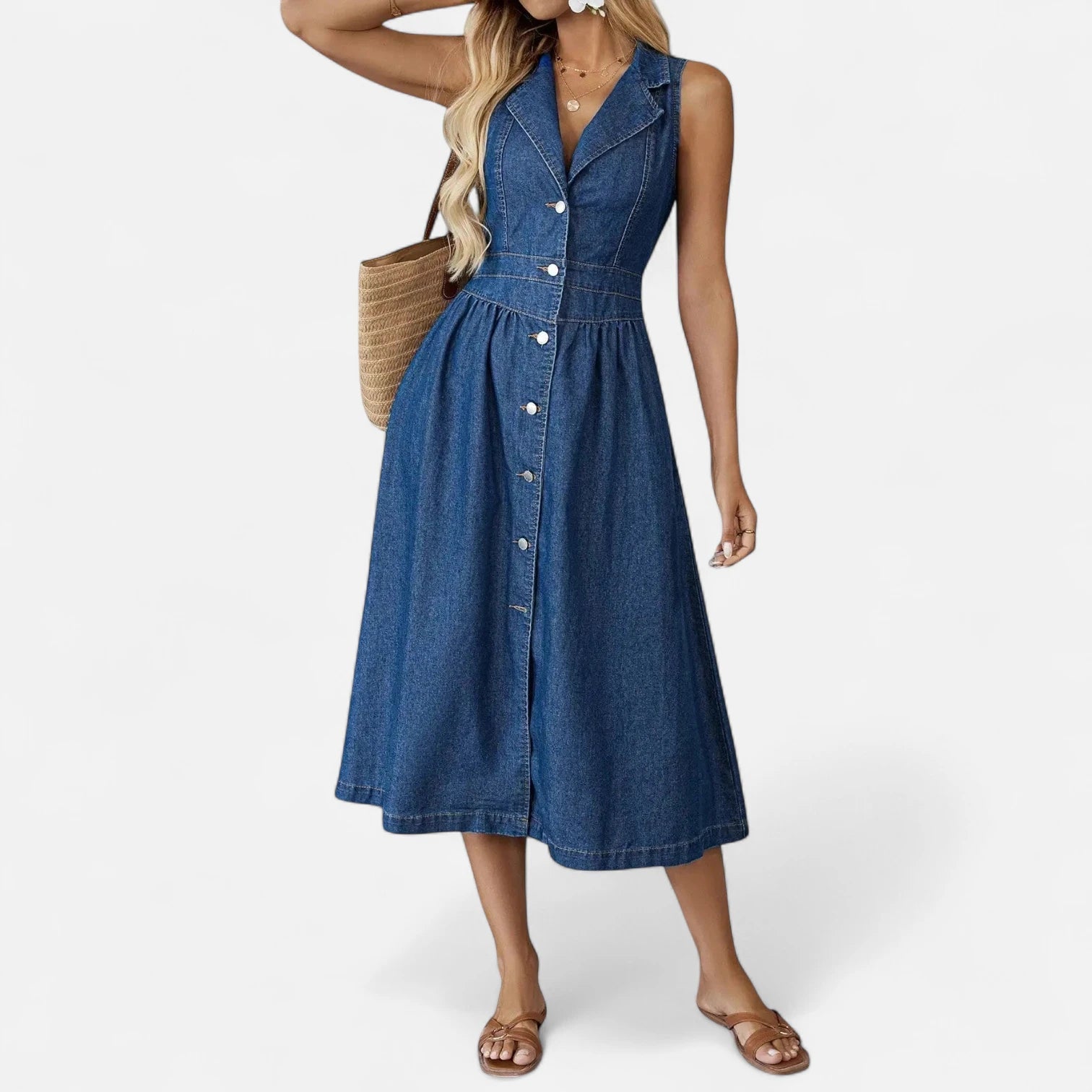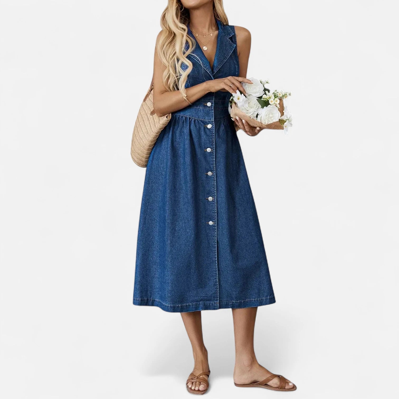 Sa coupe midi boutonnée met en valeur la taille tout en laissant place à une jupe ample et fluide. Le col à revers et le décolleté en V apportent une note raffinée, tandis que son absence de manches libère le mouvement et laisse respirer la peau. Chaque bouton argenté accentue son caractère authentique et moderne.