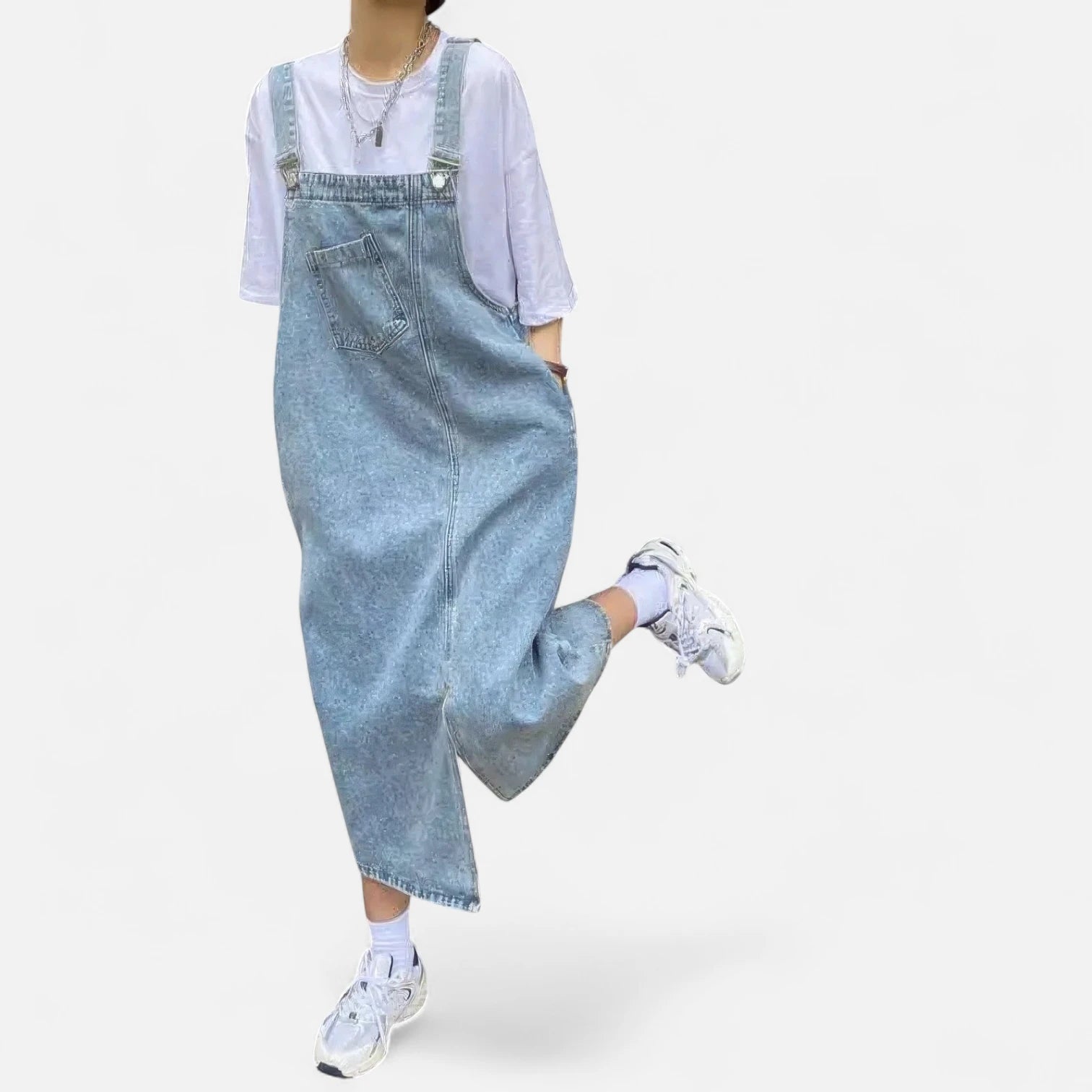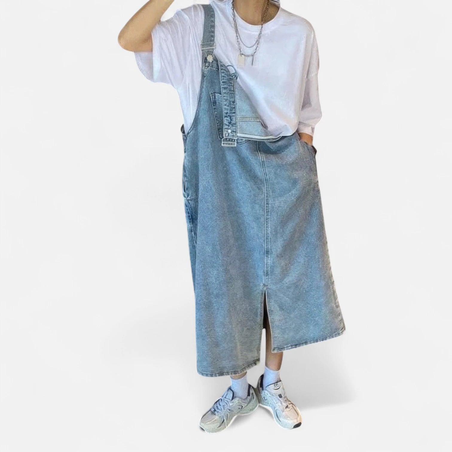 Cette robe salopette longue en jean mise sur une coupe droite et un denim bleu clair à l’aspect légèrement délavé pour une allure authentique. Sa longueur mi-mollet et sa fente frontale facilitent les mouvements tout en apportant une touche de modernité. Les bretelles réglables par attaches métalliques assurent un ajustement personnalisé, tandis que les surpiqûres apparentes et les finitions contrastées renforcent le style décontracté. L’absence de manches permet une superposition facile selon les saisons.