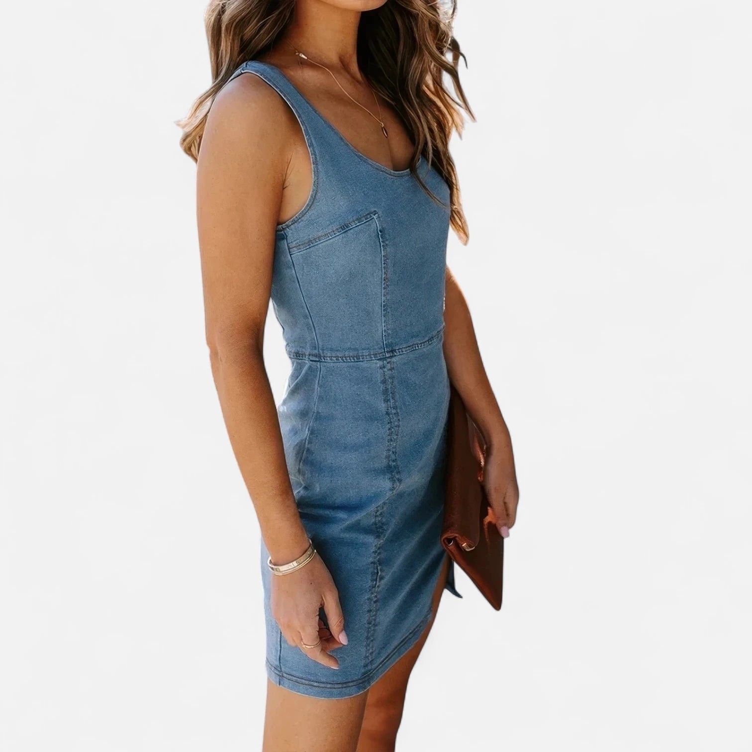 Légère et agréable à porter, cette robe sans manches s’adapte facilement à votre style. Son col arrondi, ses coutures verticales apparentes et sa coupe structurée soulignent les courbes tout en assurant un bon maintien. Le tissu en denim souple offre un tombé fluide et confortable, idéal pour les températures douces.
